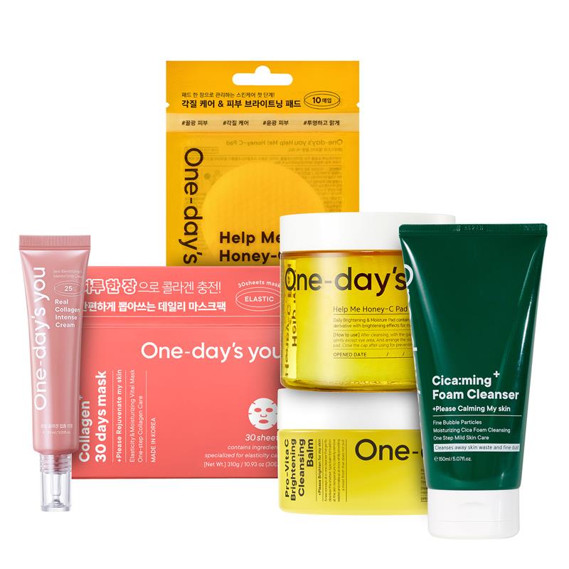 Scopri un rituale di bellezza coreano con il set One Day's You: una routine completa per la cura della pelle che deterge, illumina e rassoda. La schiuma lenitiva CICA:MING rimuove delicatamente le impurità, il balsamo YOU PRO-VITA C scioglie efficacemente il trucco e i dischetti tonificanti HELP ME HONEY-C illuminano e levigano l'incarnato. Un trattamento quotidiano con maschere COLLAGEN 30 DAYS e crema intensiva REAL COLLAGEN ripristina la tonicità, l'elasticità e la luminosità della pelle. Questo set trasforma la cura quotidiana in un rituale piacevole ed efficace.