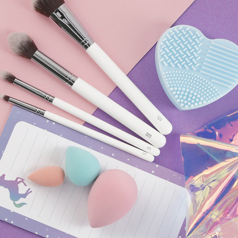 W zestawie Perfect Pick-up znajdziesz wszystko czego potrzebujesz do stworzenia nieskazitelnego makijażu twarzy i oczu. Są w nim: 4 pędzle oraz zestaw trzech miękkich gąbek w różnych rozmiarach do aplikacji podkładu, korektora lub pudru. Do tego sprytny czyścik do pędzli!