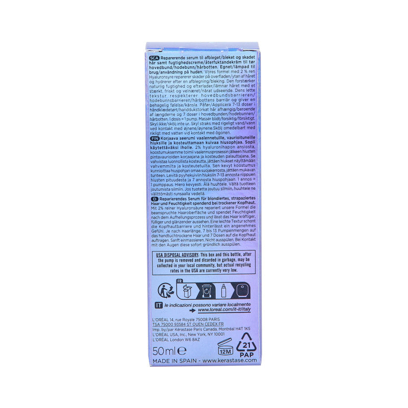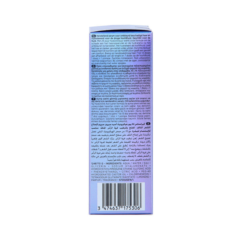 Lekkie, żelowe, przezroczyste serum z kwasem hialuronowym przeznaczone do regeneracji włosów blond oraz nawilża i ukojenia napiętej skóry głowy. Serum natychmiast nawilża włosy bezpośrednio po zabiegu rozjaśniania, jednocześnie koi skórę głowy i zachowuje hydro barierę skóry głowy. Serum jest najskuteczniejsze, gdy jest stosowane na mokre, osuszone ręcznikiem włosy, aby aktywować działanie kwasu hialuronowego. Czysty 2% kwas hialuronowy nawilża i odbudowuje rozjaśnione włosy blond. Odbudowuje uszkodzenia włókna włosa spowodowane zabiegiem rozjaśniania już po pierwszym użyciu, pozostawiając włosy o 95% mocniejsze. Serum nie zawiera parabenów i silikonów, a dzięki przyjemnemu zapachowi kwitnących kwiatów i cytrusowych nut doskonale pielęgnuje rozjaśnione blond włosy.