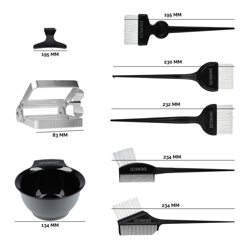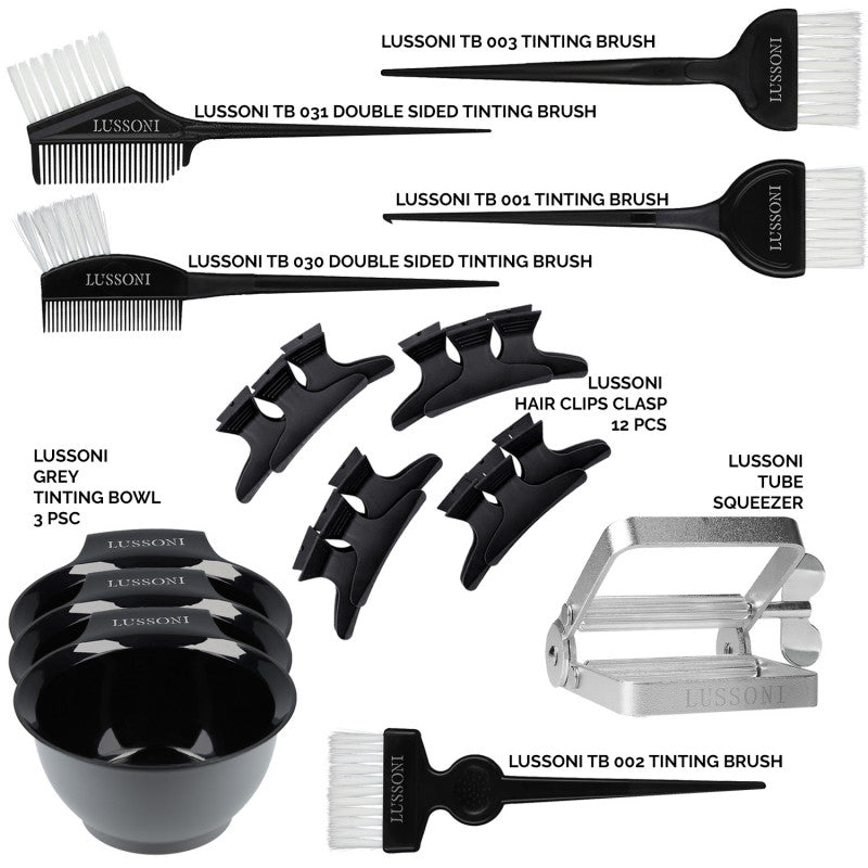 Zestaw 10 akcesoriów LUSSONI zawiera wszystko, co potrzebne do profesjonalnej koloryzacji. W jego skład wchodzą: miseczki do mieszania farby, pędzle do nakładania farby, klipsy fryzjerskie i wyciskarka do tubek.