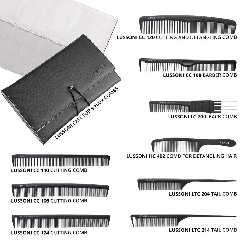 Zestaw składa się z 9 profesjonalnych grzebieni LUSSONI oraz poręcznego i trwałego etui, które chroni akcesoria.