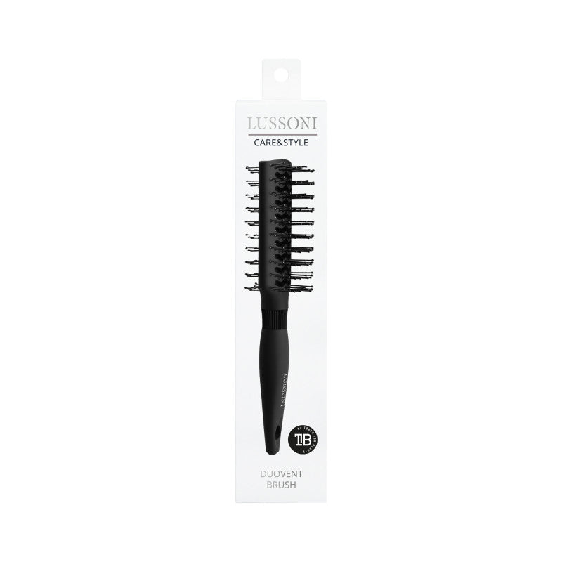 Dwustronna szczotka do stylizacji krótkich i bardzo krótkich włosów. Przydatna podczas modelowania włosów męskich oraz damskich. Szczotka Lussoni Care&Style DuoVent Brush została zaprojektowana tak, aby jak najbardziej ułatwić stylizację włosów i efektywne odbicie od skóry: wyposażona została w igiełki o dwóch długościach, antystatyczne właściwości oraz ergonomiczną rączkę.