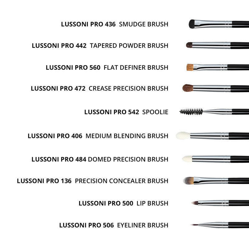 - LUSSONI PRO 472 Crease Precision Brush – precyzyjny pędzel do cieni ze sprężystym włosiem kucyka. Sprawdza się podczas aplikacji kosmetyków na dolnej powiece lub w kąciku oka. Wymiary: włosie – 11 mm, pędzel – 181 mm.