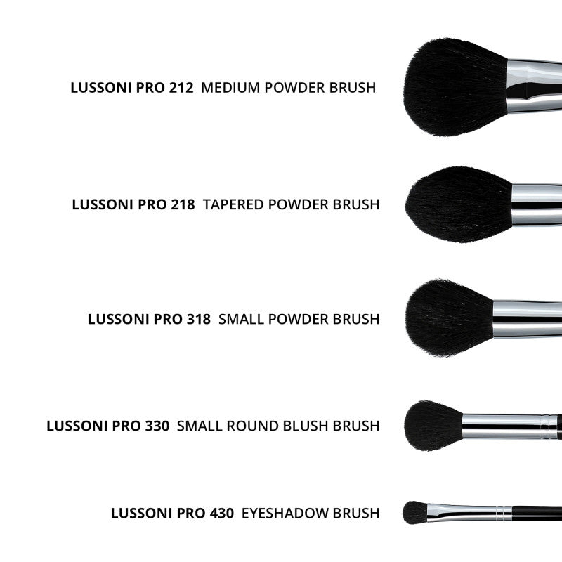 Zestaw pędzli do makijażu LUSSONI Master Kit to niezastąpiony pomocnik każdego wizażysty. To komplet profesjonalnych akcesoriów wykonanych z najwyższej jakości materiałów – trzonki z drewna wiśniowego, skuwki z miedzi, a włosie jest specjalnie wyselekcjonowane i doskonale dobrane do funkcji pędzla.