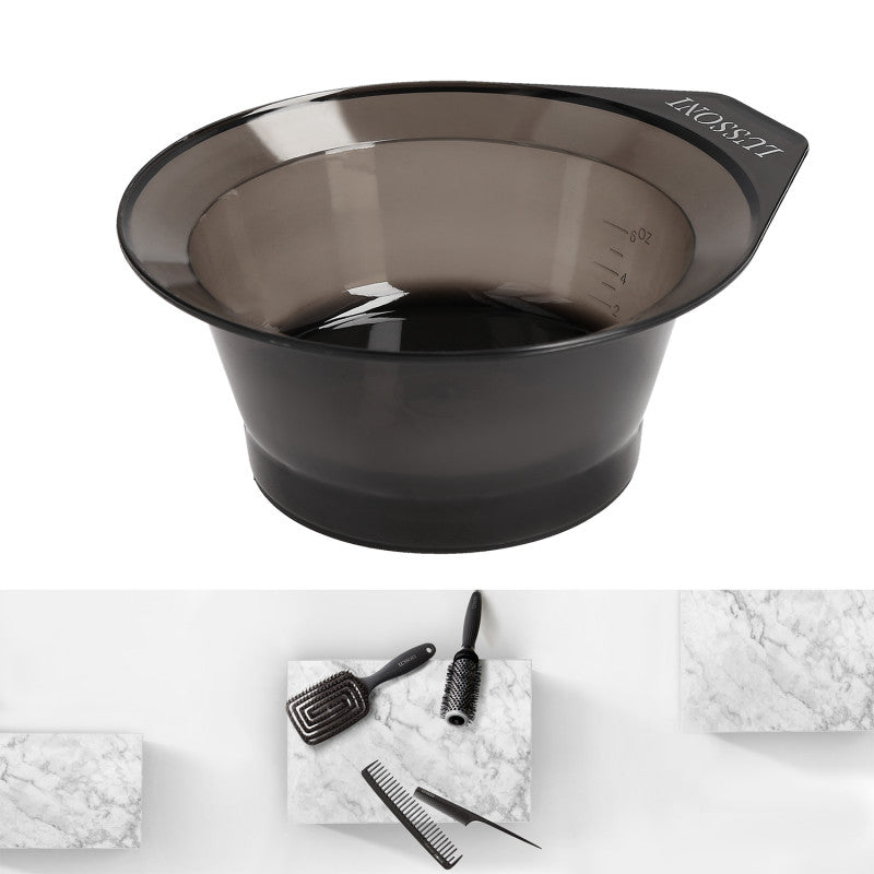 Miska do mieszania farby LUSSONI została wykonana z wysokiej jakości tworzywa. Praktyczny uchwyt oraz antypoślizgowa podstawa sprawdzają się podczas codziennej pracy kolorysty. Miarki na dnie i brzegu pomogą dokładnie odmierzyć ilość produktów do koloryzacji.