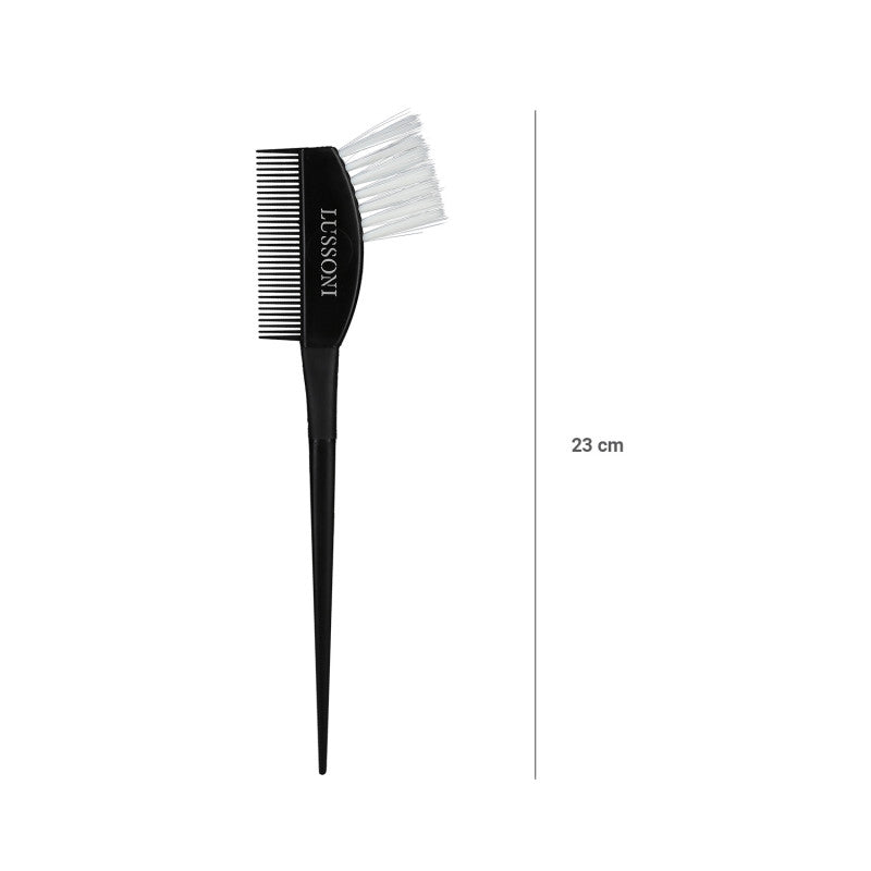 Dwustronny pędzel do koloryzacji przyda się w każdym salonie fryzjerskim. Model LUSSONI TB 030 z jednej strony ma trwałe, dobrze wyprofilowane, nylonowe włosie, z drugiej poręczny grzebień. Pomaga szybko i równomiernie nałożyć farbę. Rączka zakończona szpikulcem ułatwia dzielenie włosów na sekcje.