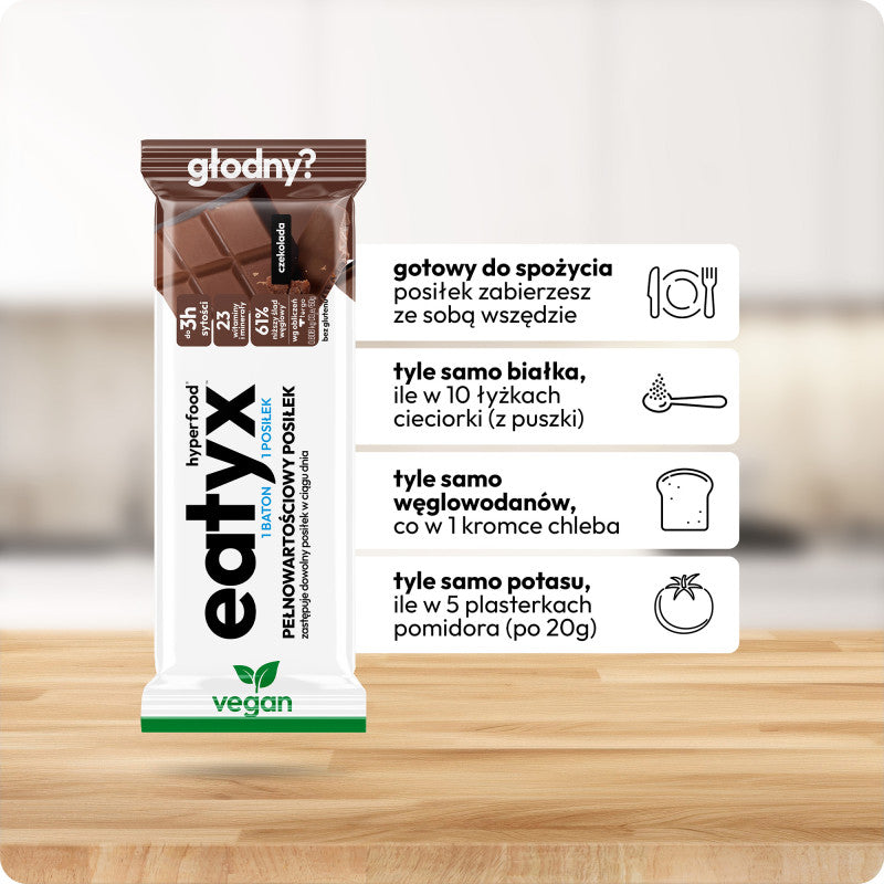 Un pasto completo, vegano e senza glutine sotto forma di barretta al gusto di cioccolato. Favorisce il mantenimento della forma fisica e la gestione del peso. Fonte di proteine, fibre, 23 vitamine e minerali. Senza zuccheri aggiunti.