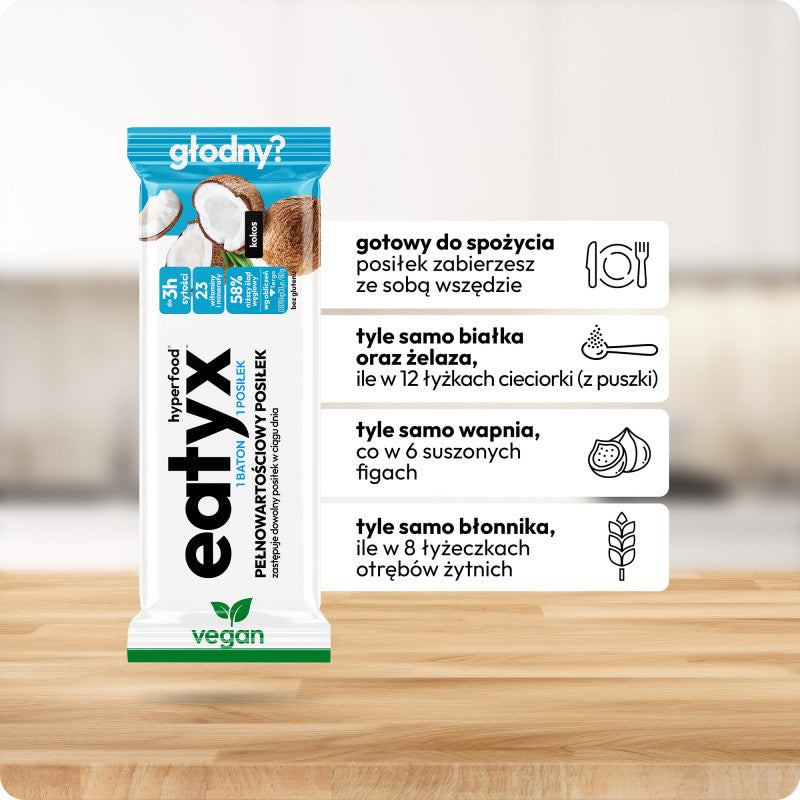 Un pasto completo, vegano e senza glutine sotto forma di barretta al gusto di cocco. Favorisce il mantenimento della forma fisica e la gestione del peso. Fonte di proteine, fibre, 23 vitamine e minerali. Senza zuccheri aggiunti.