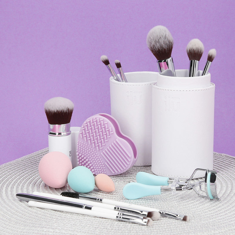 ilū Set di Pennelli professionali Make up Viso Spugne, Custodia, Pulitore Pennelli, Piegaciglia, 13 pz