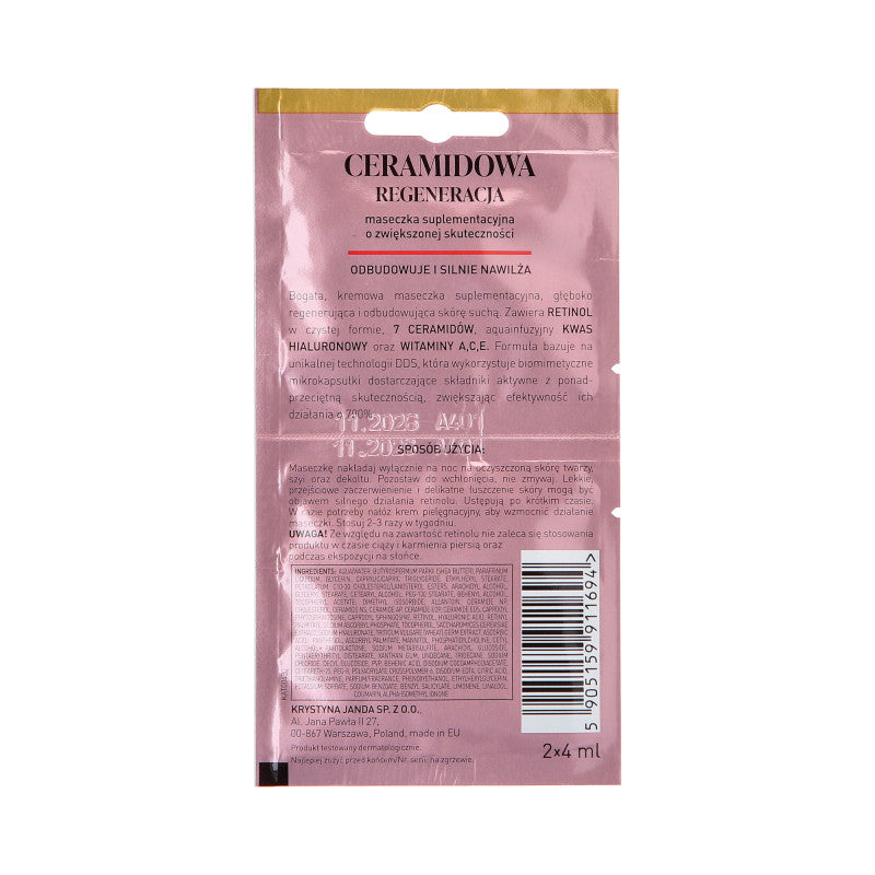 Rafforzare e nutrire la pelle del viso è la base di un aspetto sano. La maschera integrativa di Janda è stata creata pensando alla pelle che ha bisogno di rigenerazione e nutrimento. Grazie al contenuto di preziose ceramidi, vitamina E, retinolo, complesso lipidico, estratti vegetali e ingredienti che ricostruiscono la barriera idrolipidica della pelle, la maschera ripristina il livello ottimale di idratazione, protegge dalla perdita di umidità e fornisce nutrienti essenziali.