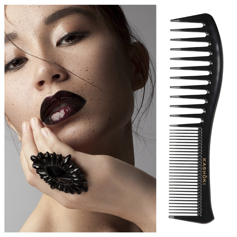 Il pettine Kashōki Tomoko è perfetto per capelli ricci (naturali o con permanente) composto da due tipologie di denti con spaziature diverse, per adattarsi bene alla pettinatura ed allo styling. È realizzato in plastica resistente. È adatto anche per districare e pettinare accuratamente i capelli in modo facile e veloce. È possibile usarlo su capelli asciutti e bagnati. Non elettrizza i capelli, è delicato sul cuoio capelluto e leggero e comodo da usare.