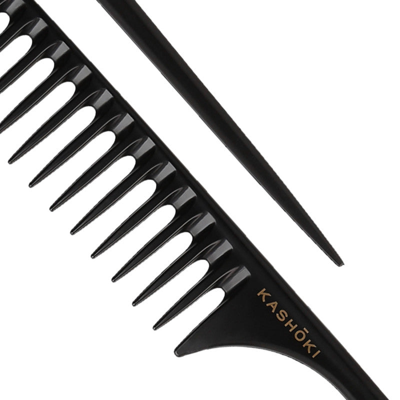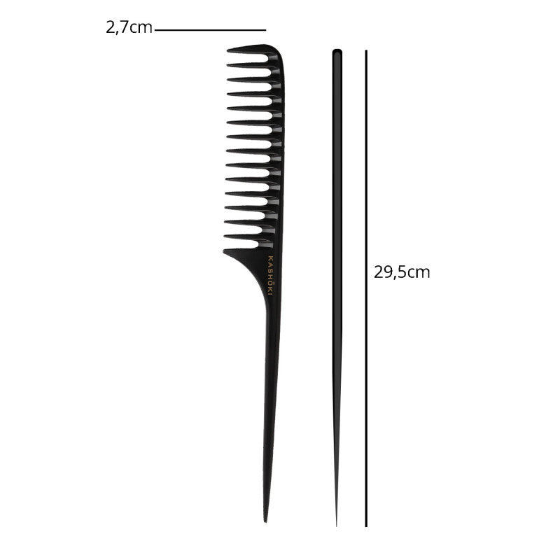 Il pettine Kashōki Aoi è perfetto per capelli molto folti, ricci o con molti nodi, sia per la pettinatura che lo styling. È realizzato in plastica resistente. È adatto anche per districare e pettinare accuratamente i capelli in modo facile e veloce ed anche per distribuire uniformemente balsamo, maschere e oli. La parte finale a spiedino facilita la divisione in sezioni delle ciocche. È possibile usarlo su capelli asciutti e bagnati. Non elettrizza i capelli, è delicato sul cuoio capelluto e leggero e comodo da usare. Impugnatura ergonomica.