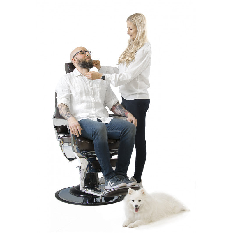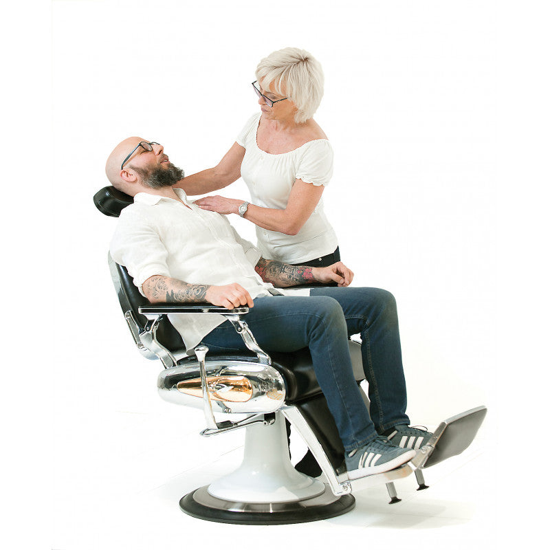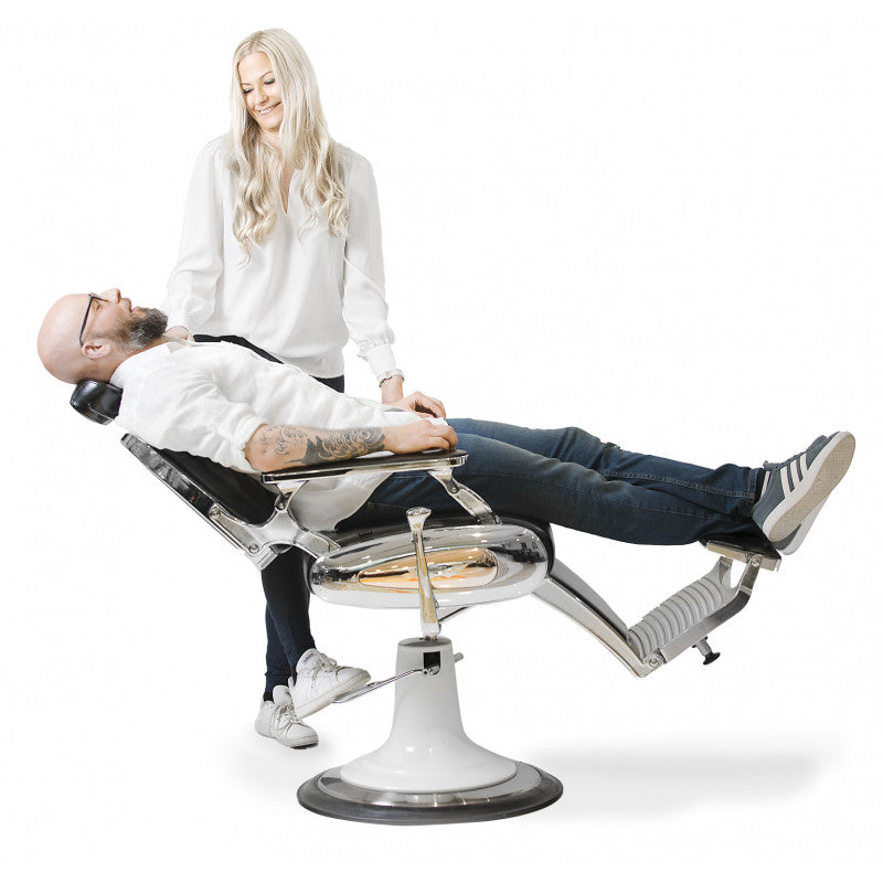 Sakai Furniture Harold è una poltrona da barbiere ampia, funzionale ed elegante con pompa idraulica bloccabile, schienale reclinabile e supporto regolabile per collo e gambe. Il sedile e i braccioli comodi e morbidi sono imbottiti con un rivestimento resistente e di facile manutenzione. Il poggiapiedi rialzato aumenta il comfort del cliente e il design ergonomico migliora il lavoro del parrucchiere.