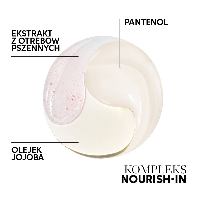 Contiene la formula Nourish-In Complex ricca di olio di jojoba ed estratto di crusca di frumento. L'olio di jojoba idrata e nutre i capelli che risultano protetti e riacquistano la loro naturale umidità. Inoltre, l'estratto di crusca di frumento, ricco di vitamine A ed E, li rafforza e agisce come antiossidante.