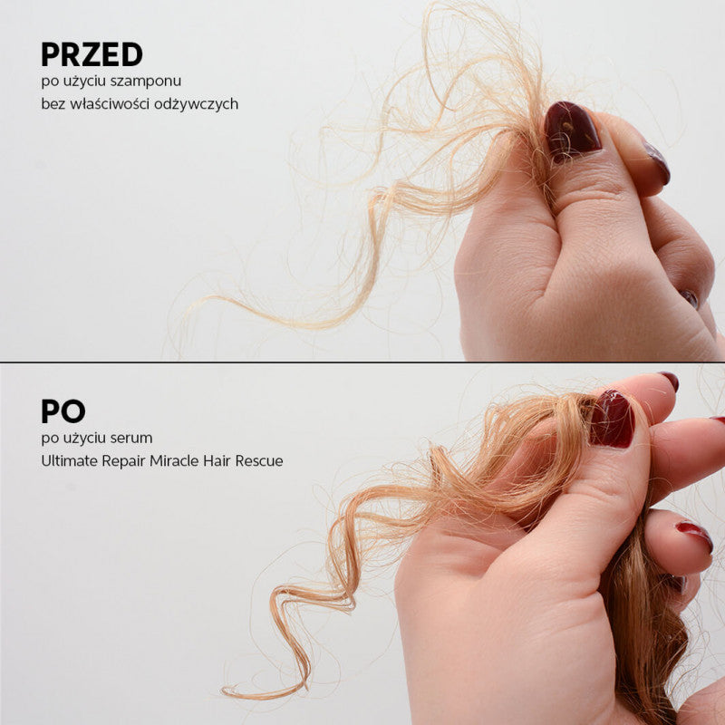 Il lussuoso trattamento Miracle Hair Rescue sotto forma di siero è la terza fase del rituale di cura dei capelli Ultimate Repair. In soli 90 secondi ricostruisce i capelli danneggiati meccanicamente dall'interno e dall'esterno. La tecnologia innovativa a base di alfa-idrossiacido AHA e omega-9 rigenera e ricostruisce efficacemente i capelli. Rende i capelli più forti, resistenti alla rottura e a tutti i tipi di danni. I capelli diventano visibilmente più lisci, lucenti e la pettinabilità risulta molto più semplice. Grazie al fatto che il siero è molto concentrato, il prodotto è caratterizzato da un'efficacia straordinaria. Non contiene parabeni, non è testato sugli animali e ha una formula vegana.